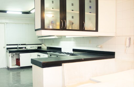 En cada piso cuenta con 8 habitaciones con baño y además cada uno tiene una cocina totalmente equipada con refrigerador y microndas, lavaplatos y utensilios para que los estudiantes preparen, si lo desean platos fàciles; además cuentan con alacenas para que guarden sus cosas.
